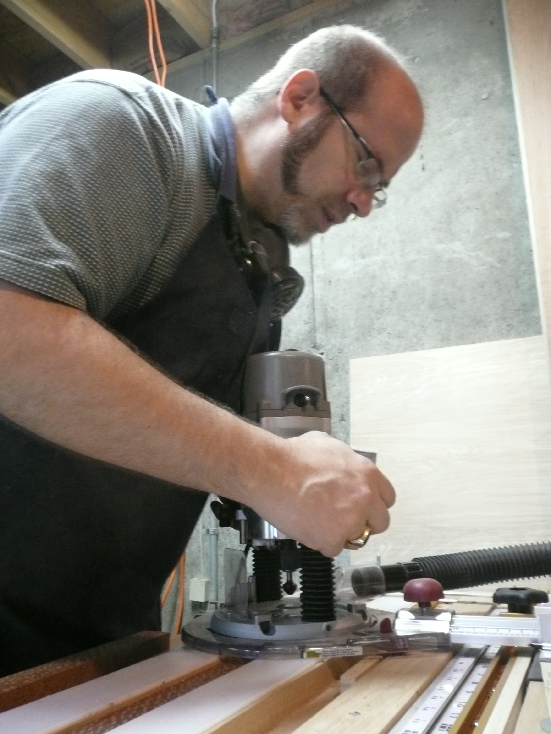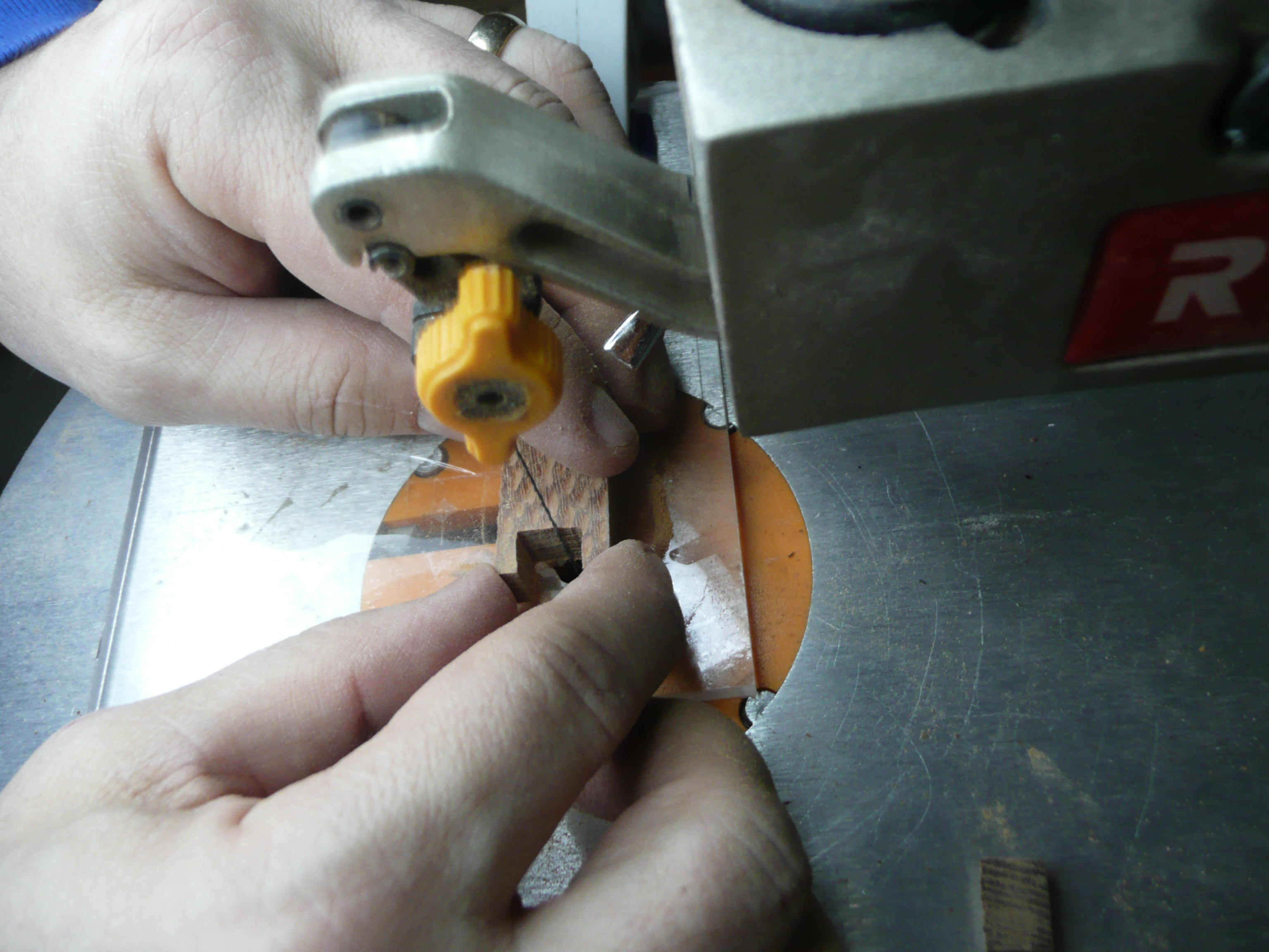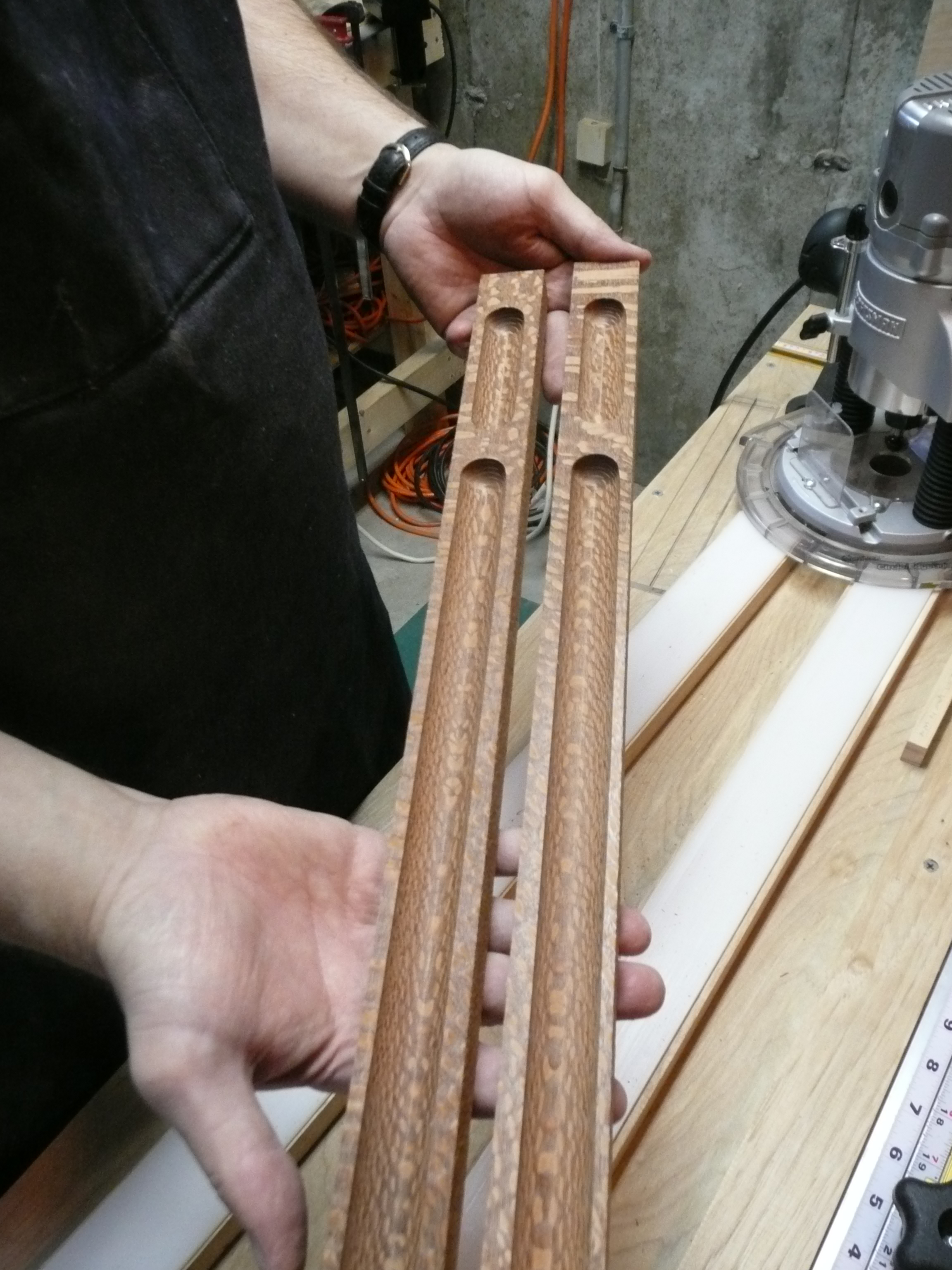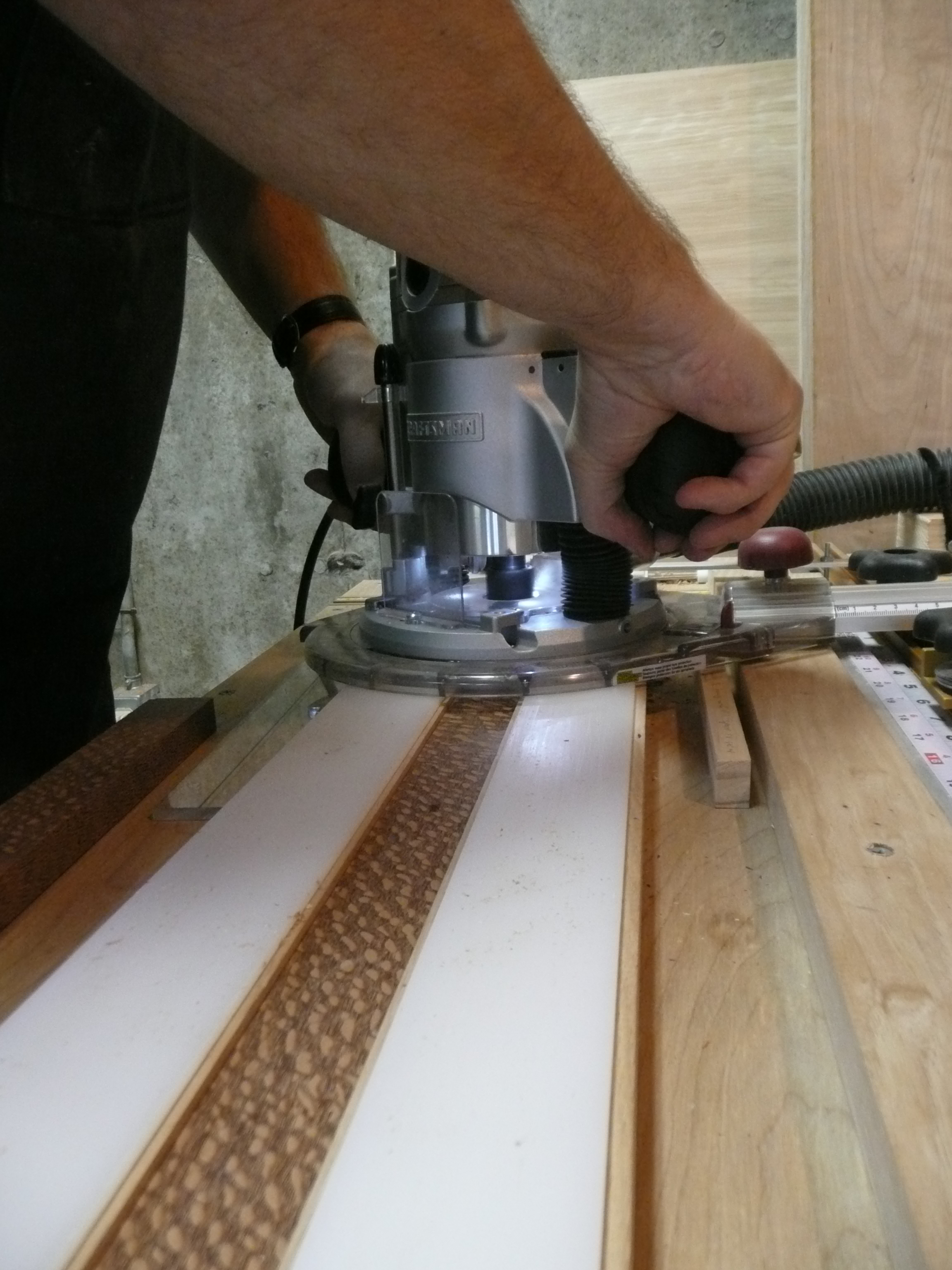 After the blanks have been cut to size, they are routed out. This forms the SAC (slow air chamber), main bore, nest and flue. The nest and flue are visible in the last picture in this section and look like concentric elipsis. I custom built the router table specifically for routing flute blanks and have since updated it to a much simpler design. I prefer to route my blanks using a plunge router rather than using a table with a fixed router as it gives me better control. Three separate router bits are used. A roundnose bit for the SAC and main bore, a straight flat bottom bit for the nest and a smaller straight flat bottom bit for the flue. I route the flue a little bit deeper than it will end up in the finshed flute so that the nest can be re-flattened after turning on the lathe. The mouth end of the flute is left solid at this point. The mouth opening will be added in a later step.