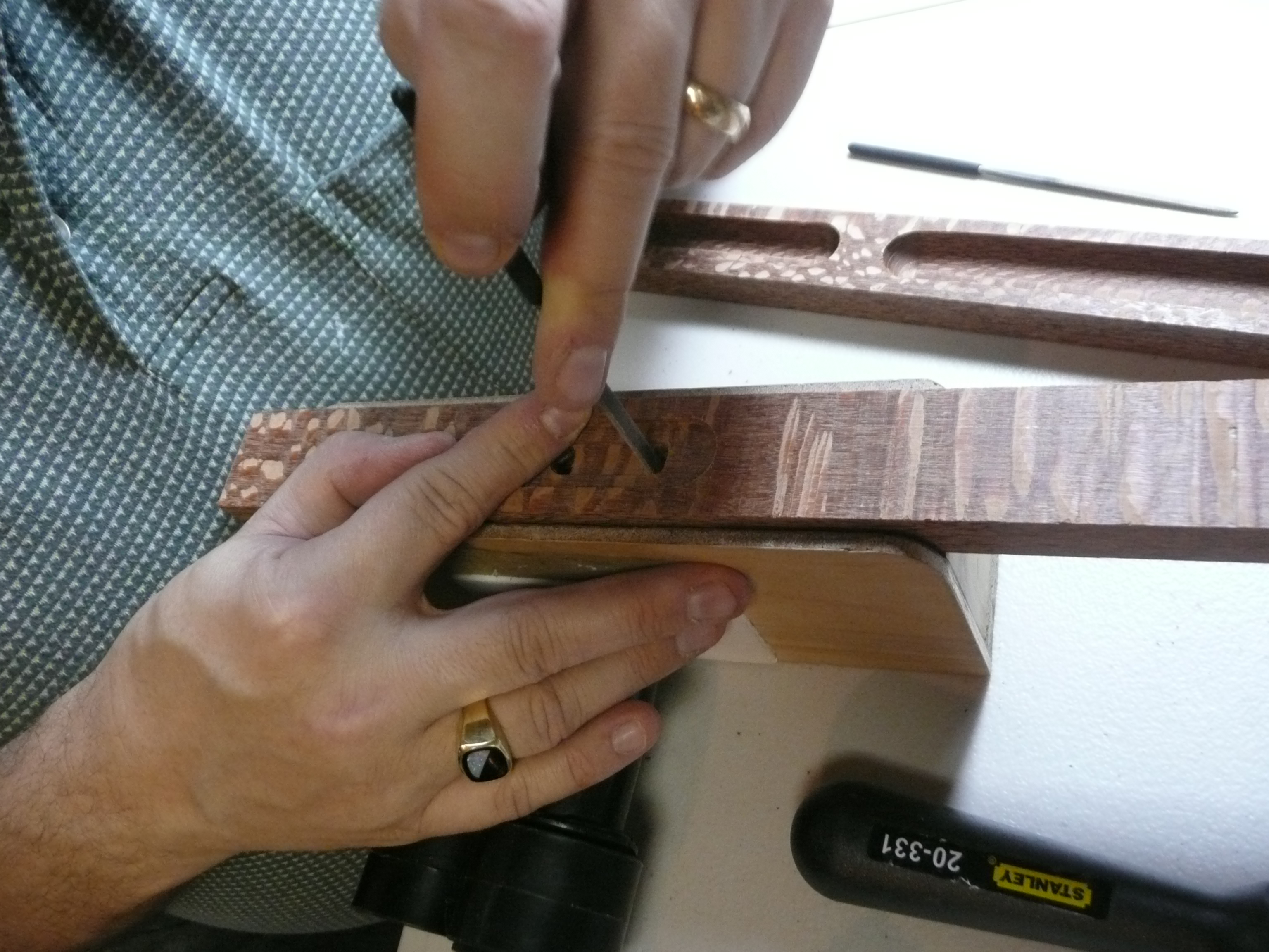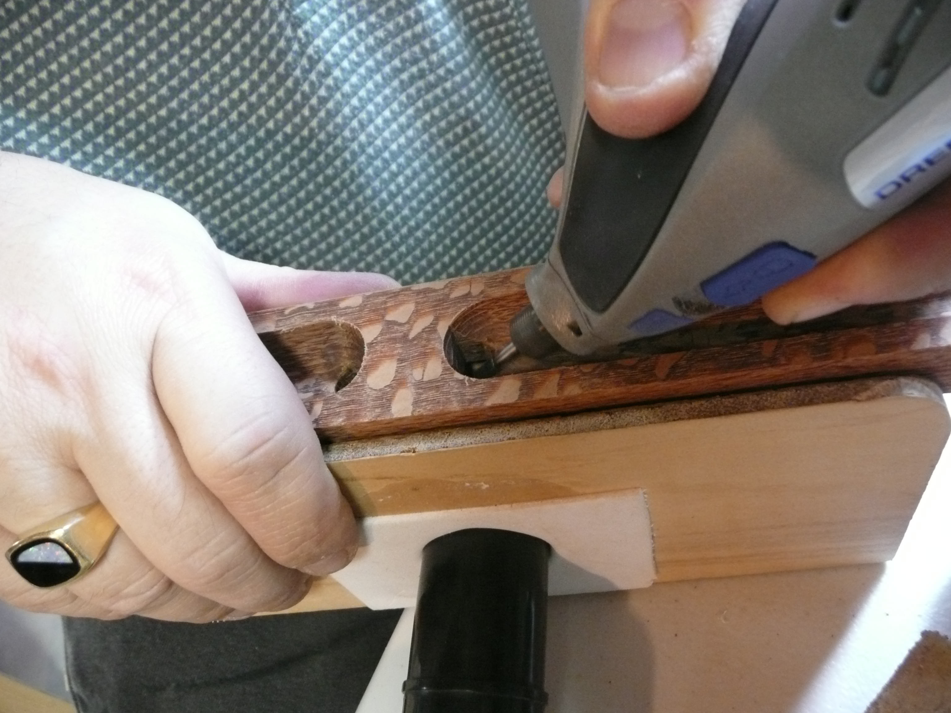 I prefer to do the major roughing in of the SAC Exit and the TSH (True Sound Hole) areas before glueing the to blank halves together. I use a combination of a dremel Stylus with an 1/8 inch straight high speed cutting bit and a set of small files. I get these areas close to their final form, but try not to over work them as the exact height of the nest will not be determined until after the flute has been turned on the lathe.