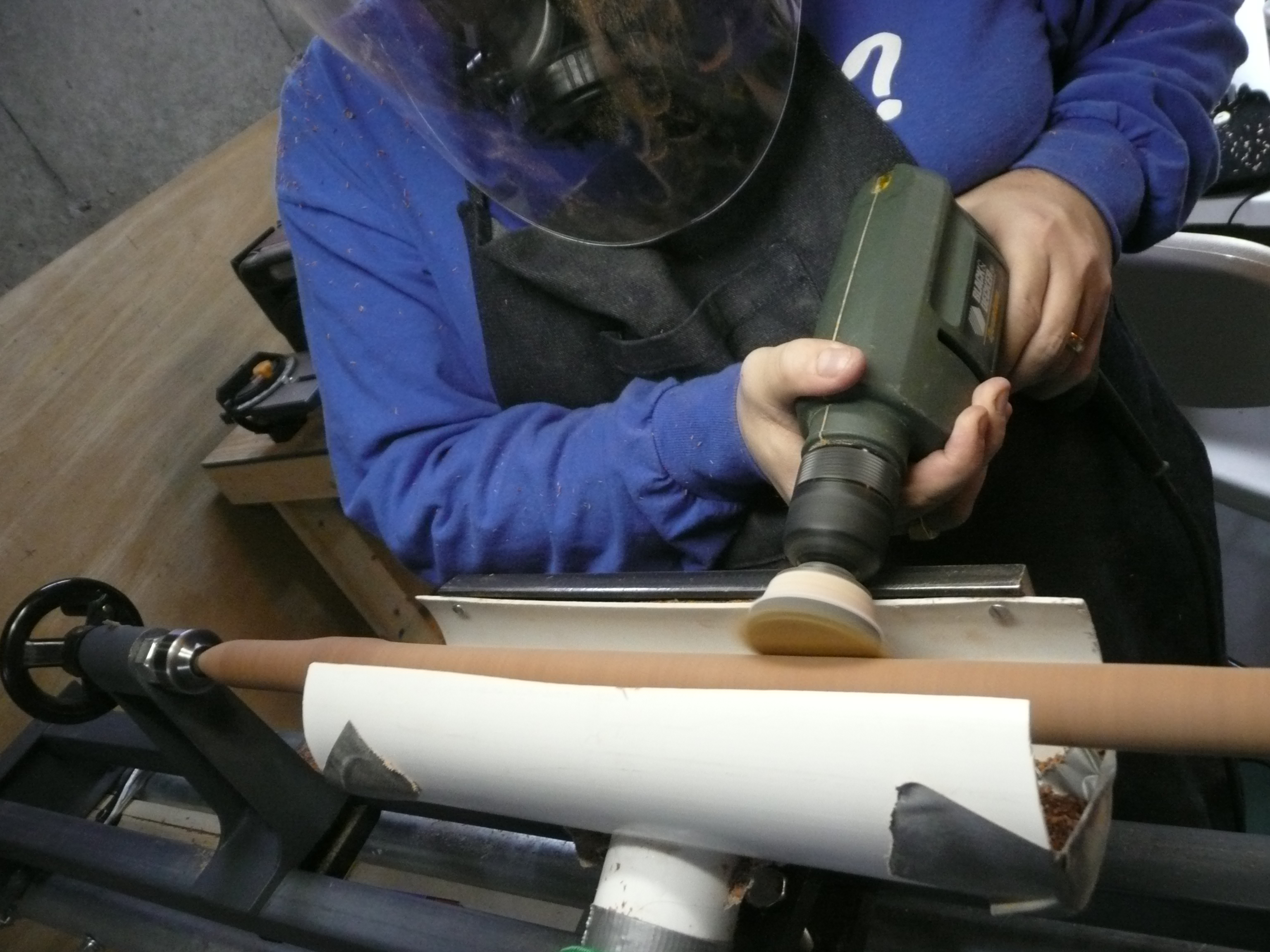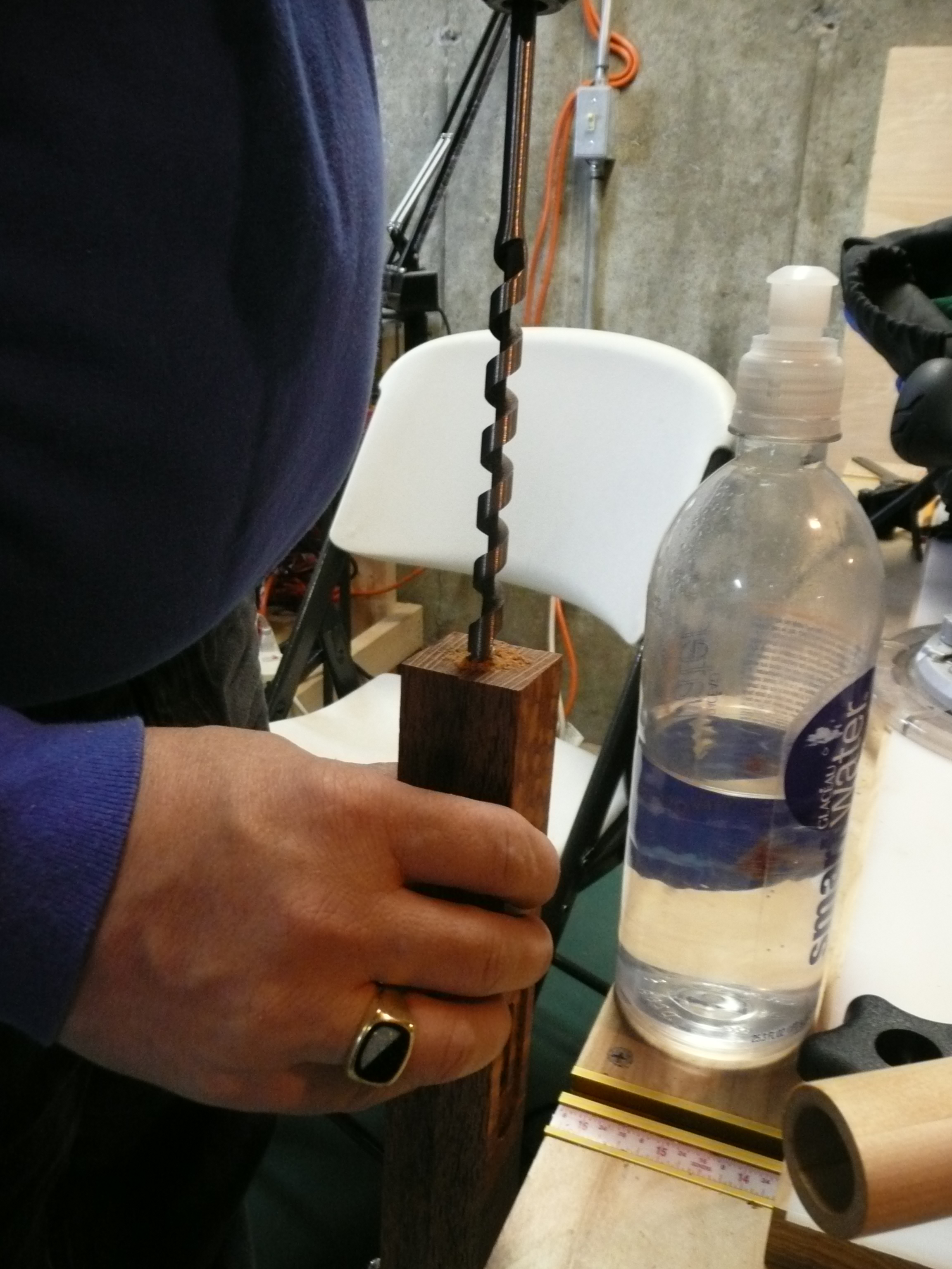 After the flute has been turned, I use the same 3/8 inch auger bit to finish boring the mouth opening. This process creates a perfectly symetrical mouth end of the flute. I then sand the inside of the bore using sandpaper wrapped on the end of a wooden dowel.