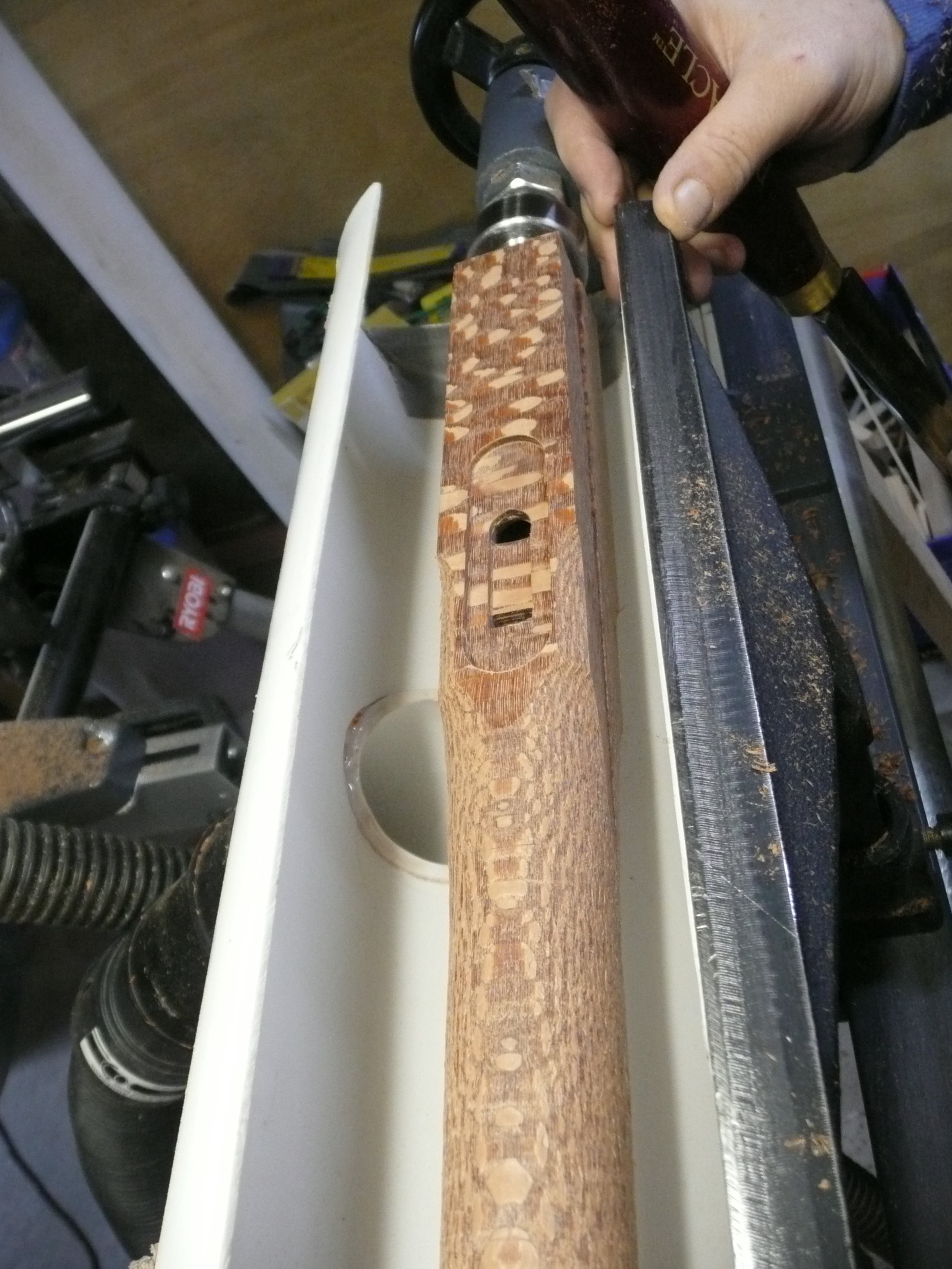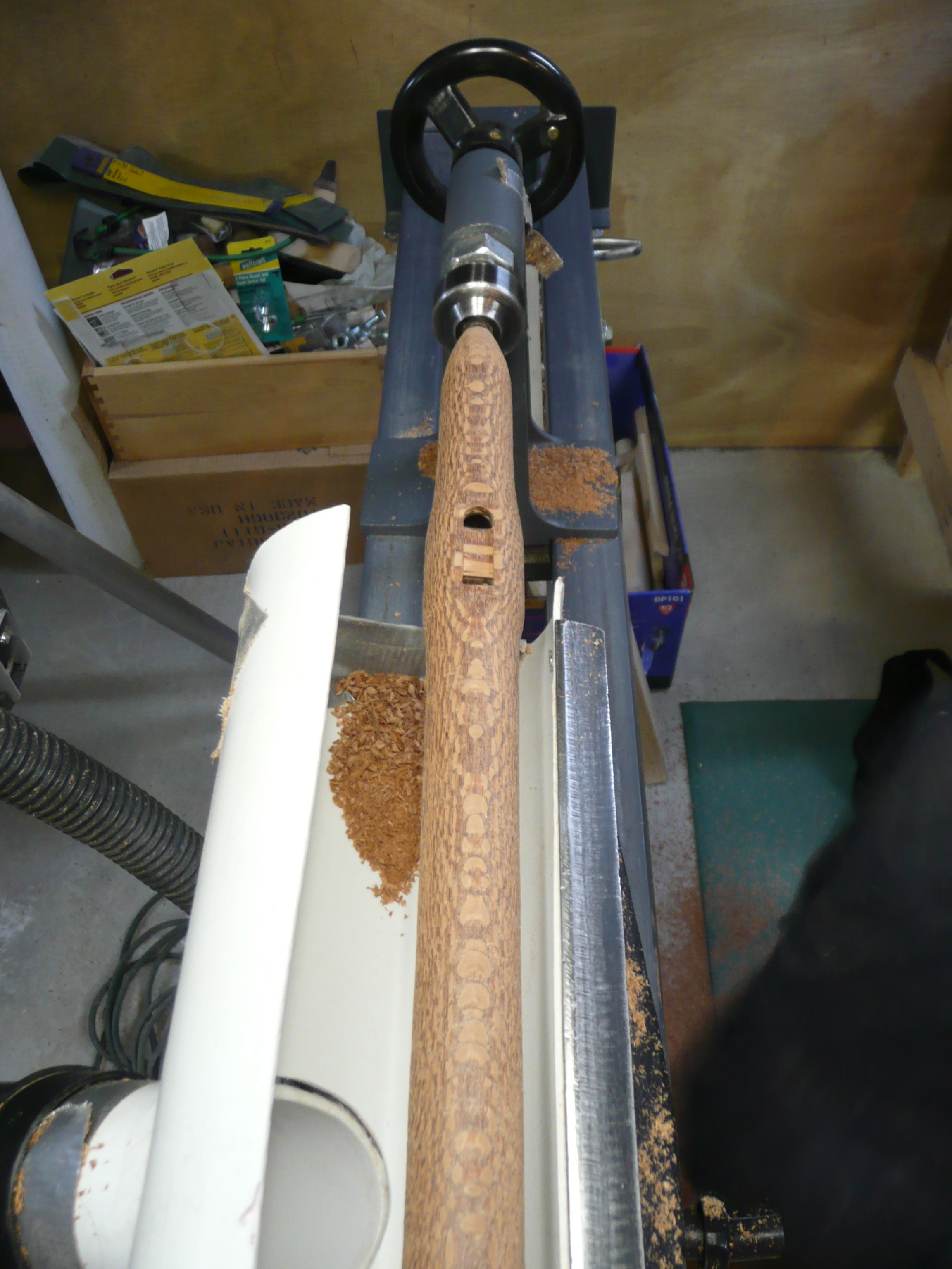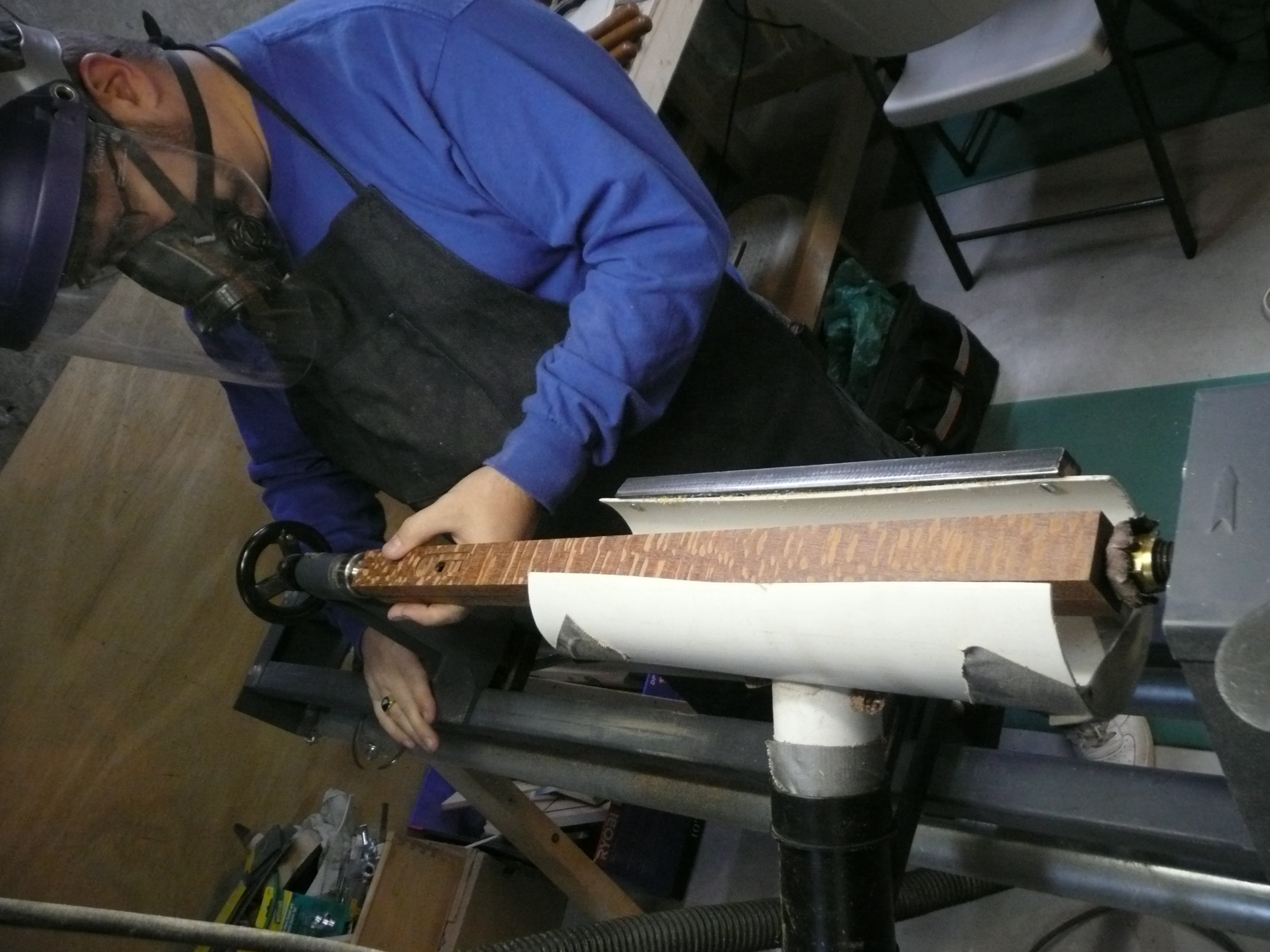 When I first started making flutes, I worked mostly in cedar and hand planed them. Since then I have become alergic to cedar and work mostly in hardwoods now. I also switched to turning my flutes on a lathe. Before the flute is mounted on the lathe, I use a 3/8 inch auger bit to mark the position where the mouth opening will be drilled. This is then used as a mounting point for the tail stock of the lathe. I use a roughing gouge for the major work and a skew chisle to form the tapered mouth piece. A small bowl sanding attachment with various grits of sandpaper smooth things out and remove any tool marks. I run the drill in reverse to counteract the rotating motion provided by the lathe during sanding.